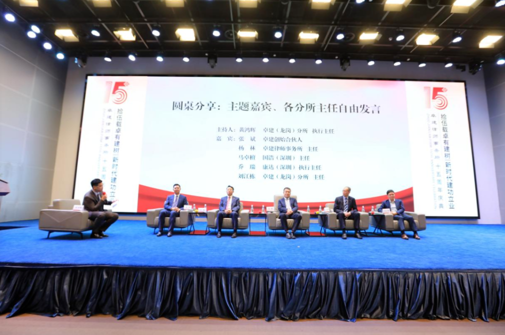 在圆桌分享环节中,邀请的嘉宾有深圳市律协会长、广东卓建创始人张斌、广东卓建律师事务所主任杨林、国浩(深圳)律师事务所主任马卓檀、康达(深圳)律师事务所执行主任乔瑞、广东卓建(龙岗)律师事务所主任刘江栋。对话嘉宾以“律所在发展过程中如何兼顾到速度与质量”、“总分所联动中,如何实现总所优势资源和分所地方资源、特色业务的有效整合?”、“分所的一个优势在于有总所的标准和服务,各地经济发展都存在不均衡性,如何实现资源本土化、而服务保持标准化?”、“如何处理好总所与分所、分所与分所之间利益冲突的问题?”等同行聚焦和关心的问题为对话主题,畅谈见解、分享经验。嘉宾们的发言干货满满,赢得了与会人员的阵阵掌声。